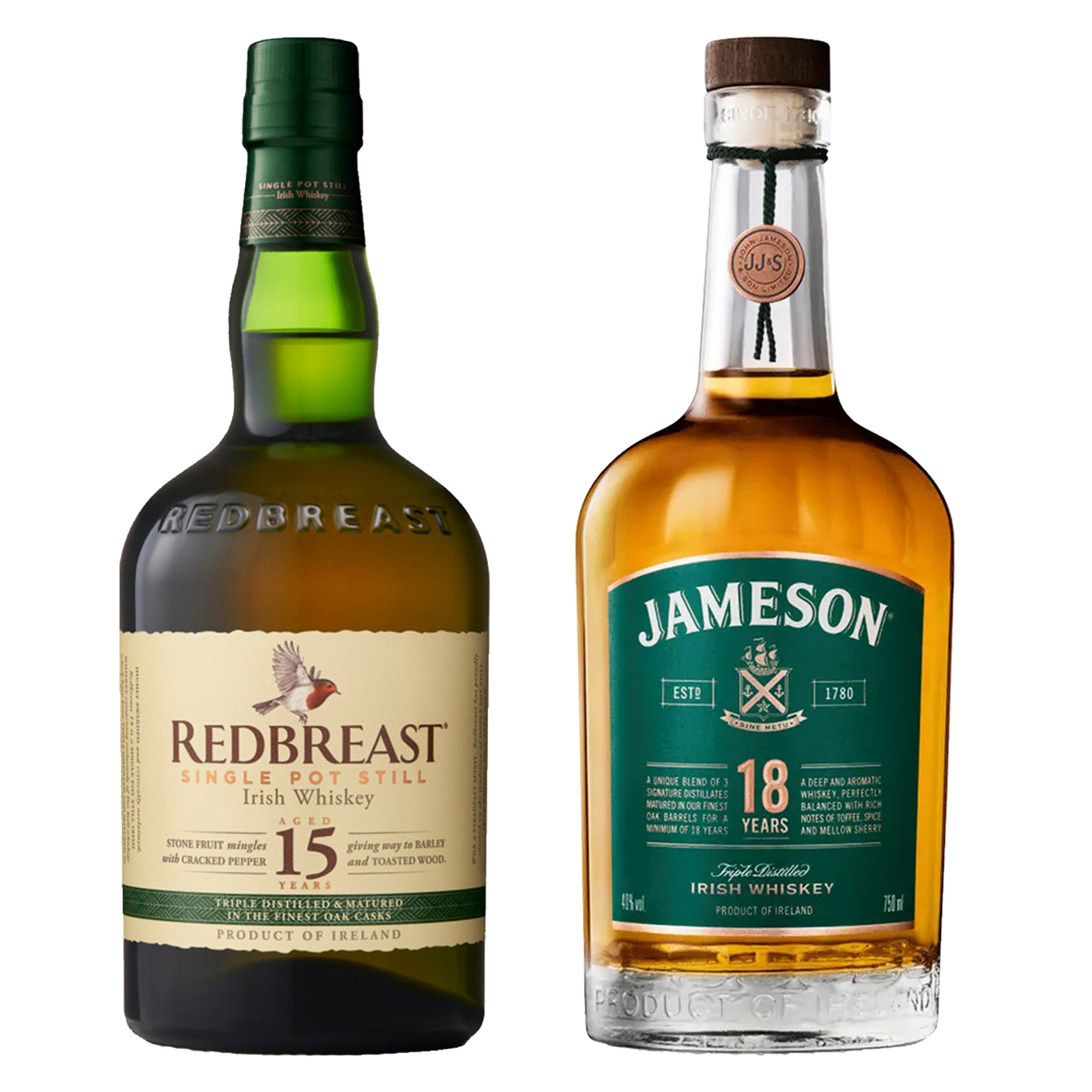 Jameson Blended Irish Whiskey 18 Year& Redbreast Single Pot Still Irish Whiskey 15 Year Bundle