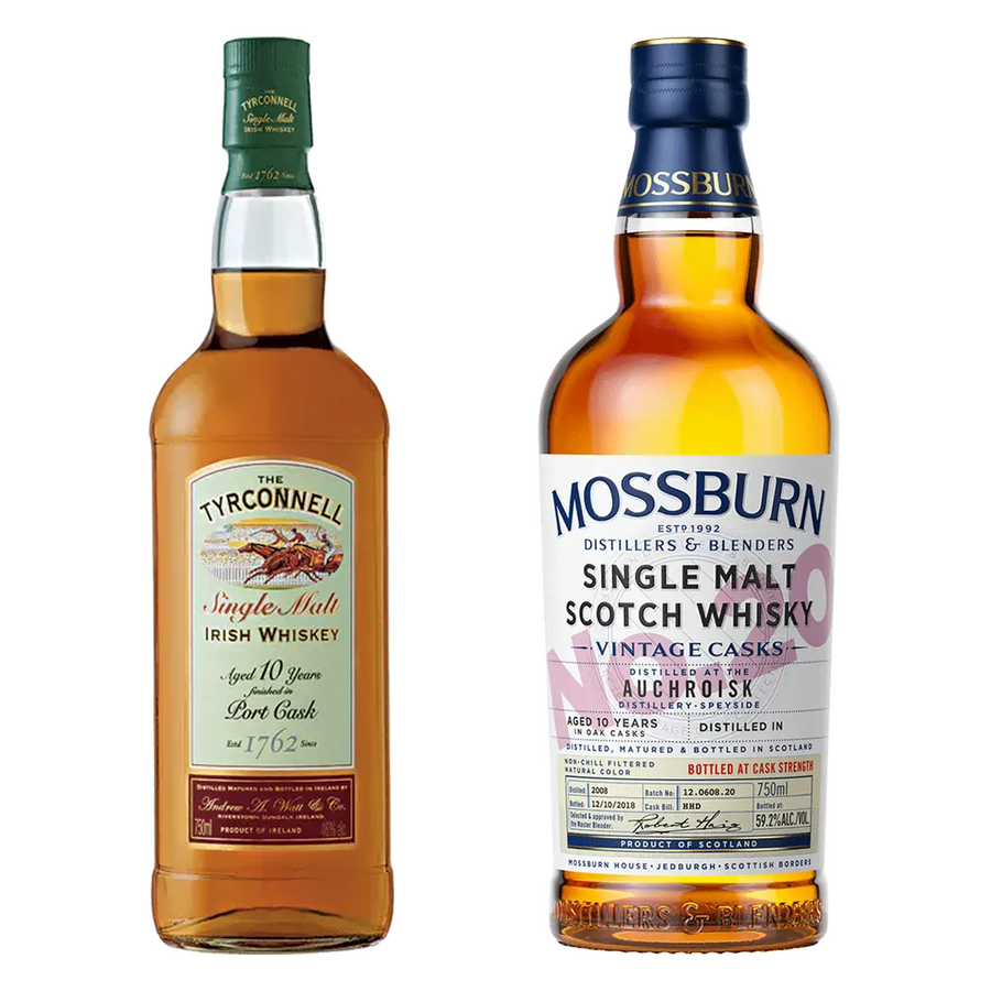 The Tyrconnell Single Malt Irish Whiskey Port Cask Finish is crafted in Ireland, rooted in a legacy that dates back to the 19th century, utilizing traditional pot still methods and unique cask finishes. Mossburn Single Malt Scotch Inchgower Distillery Vintage Casks No. 2 10 Yr Bundle hails from the renowned Inchgower Distillery, celebrated for its rich, fruity style and meticulous aging processes that enhance its global appeal.